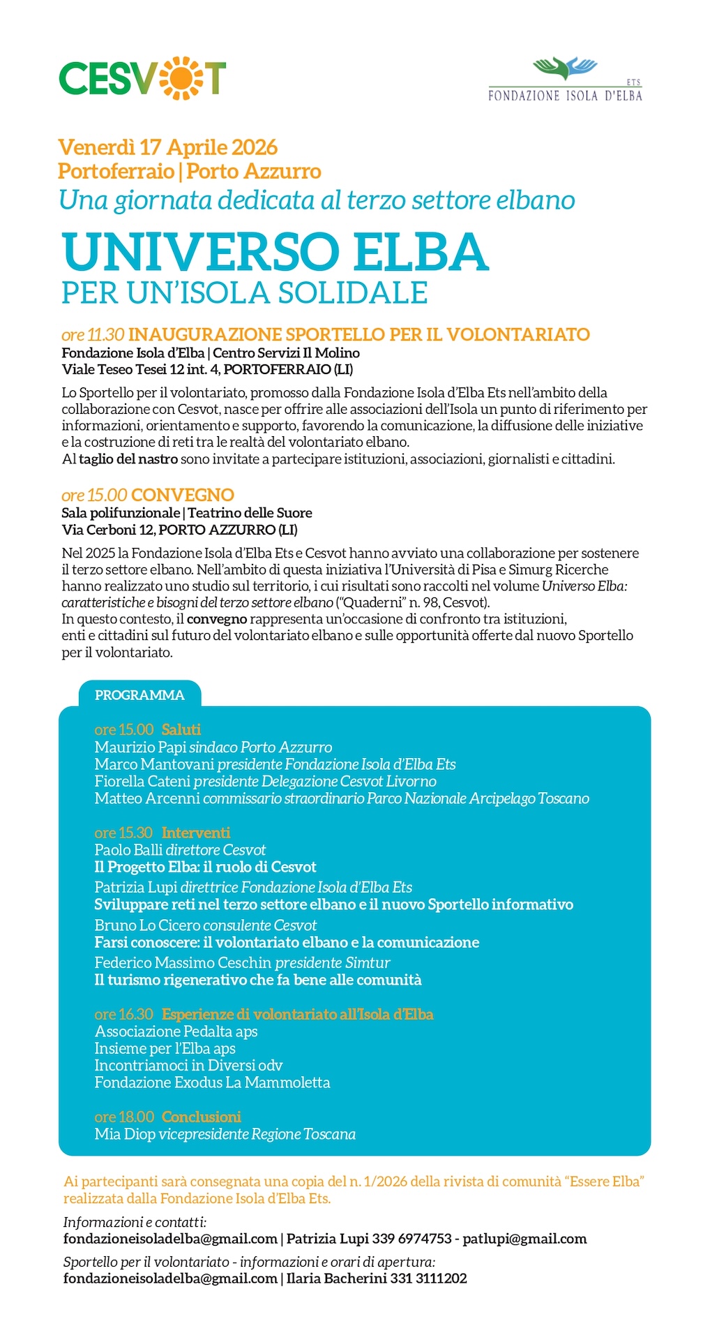 Universo Elba per un’isola solidale Venerdì 17 aprile, alle ore 11,30 a Portoferraio e alle ore 15 a Porto Azzurro presso il Teatrino delle Suore, si terrà l’inaugurazione dello sportello di aiuto e sostegno al volontariato e convegno dedicato al tema del volontariato. Condividi Articoli correlati17 Febbraio 2026Volontariato in Festa a Portoferraio e Porto AzzurroLeggi tutto13 Gennaio 2026Fondo “Supporto Salute”Leggi tutto5 Dicembre 2025Appuntamento al prossimo anno per il progetto “Cambio di Rotta”Leggi tutto